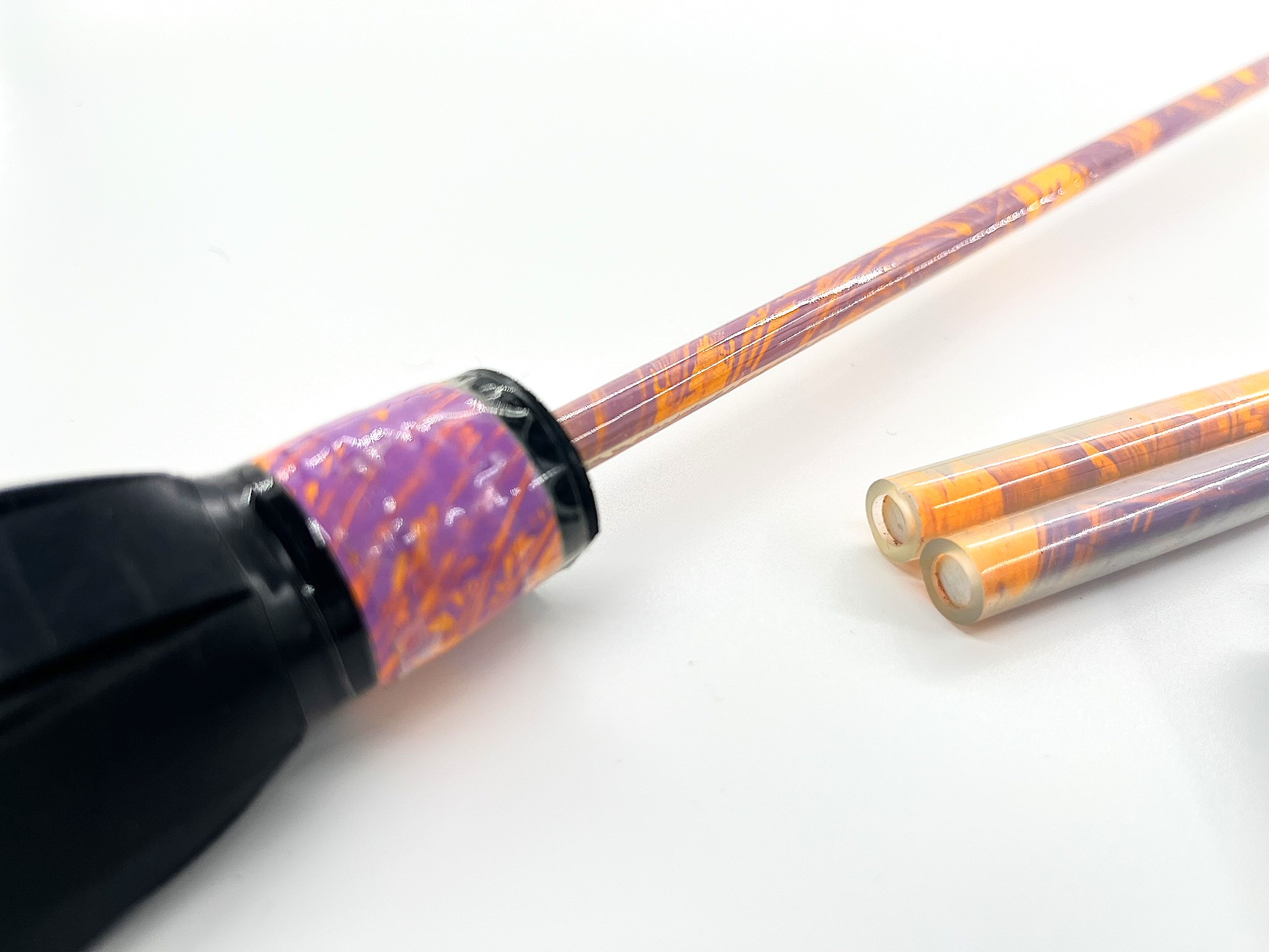 Handmade, full fiberglass flowerstick, orange colored with purple painted pattern.